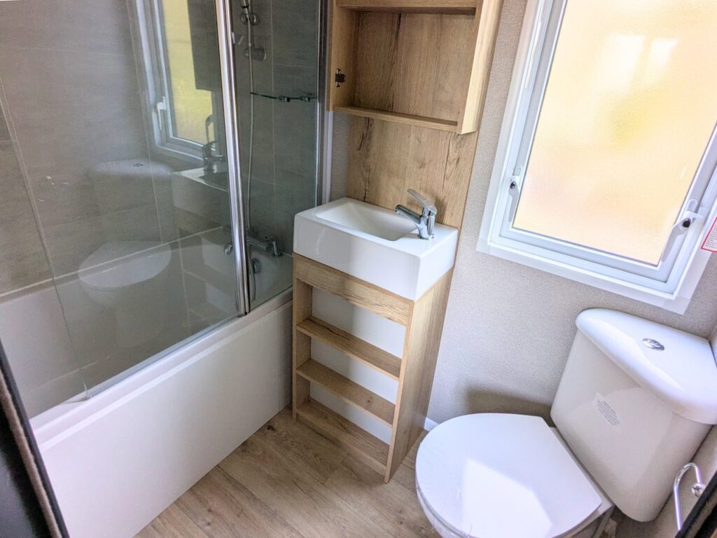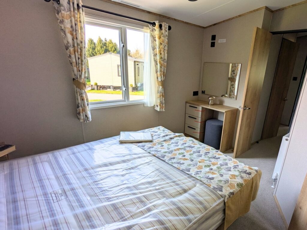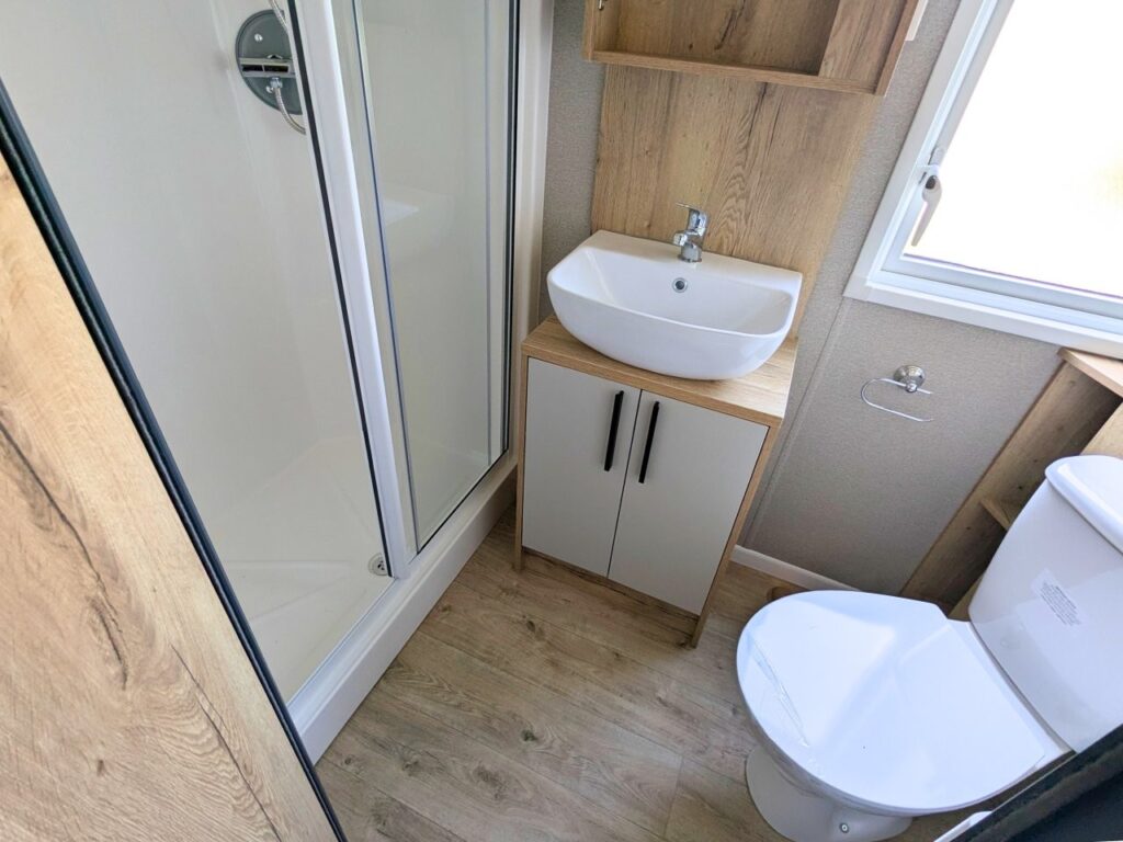 The ABI Attingham is a 2024 static caravan holiday home that is 39 feet long and 12 feet wide, and it has two bedrooms, two bathrooms, an open-plan living area, and a kitchen.